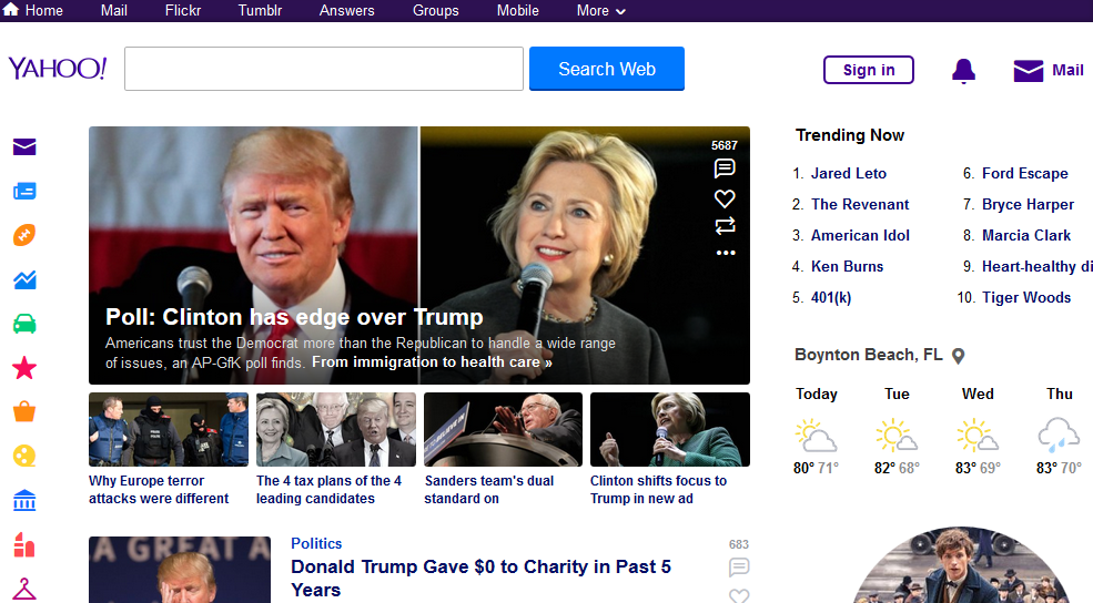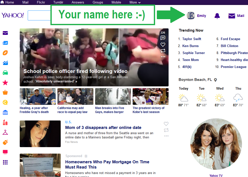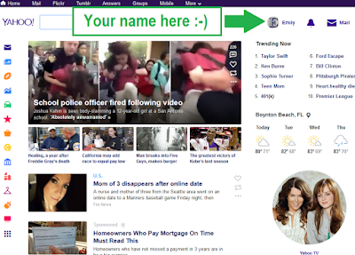 First, using any web browser on your PC, Mac or mobile device and go to the homepage of Yahoo at yahoo.com. You can also just search for "Yahoo" in the search engines your favorite. The site will look a bit different as the news headlines change, but in general it looks something like this.
